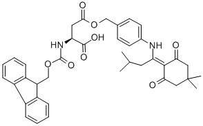 FMOC-L-ASPARTIC ACID BETA-4-[N-[1-(4,4-DIMETHYL-2,6-DIOXOCYCLOHEXYLIDENE)-3-METHYLBUTYL]AMINO]BENZYL ESTER; FMOC-ASP(ODMAB)-OH;FMOC-ASPARTIC ACID(ODMAB); N-ALPHA-(9-FLUORENYLMETHOXYCARBONYL)-L-ASPARTIC ACID BETA-4-[N-[1-(4,4-DIMETHYL-2,6-DIOXOCYCLOHEXYLIDENE)-3-METHYLBUTYL]AMINO]BENZYL ESTER; N-ALPHA-FMOC-L-ASPARTIC ACID BETA-4-[N-[1-(4,4-DIMETHYL-2,6-DIOXOCYCLOHEXYLIDENE)-3-METHYLBUTYL]-AMINO] BENZYL ESTER;Fomc-Asp(Odmab)-OH; N-[(9H-Fluoren-9-ylmethoxy)carbonyl]-L-aspartic acid 4-[[4-[[1-(4,4-dimethyl-2,6-dioxocyclohexylidene)-3-methylbutyl]amino]phenyl]methyl] ester; (S)-2-(((9H-fluoren-9-yl)methyl9H-fluoren-9-yl)methoxy)carbonylamino)-4-(4-(1-(4,4-dimethyl-2,6-dioxocyclohexylidene)-3-methylbutylamino)benzyloxy)-4-oxobutanoic acid |