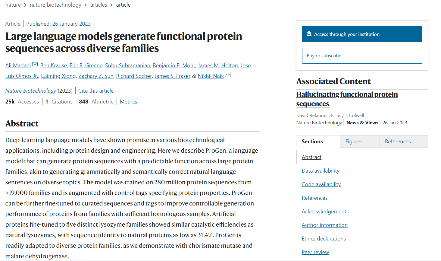 該研究以「Large language models generate functional protein sequences across diverse families」為題,于 2023 年 1 月 26 日發(fā)布在《Nature Biotechnology》上。