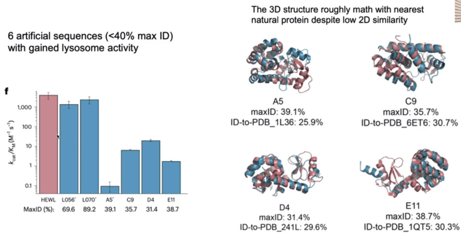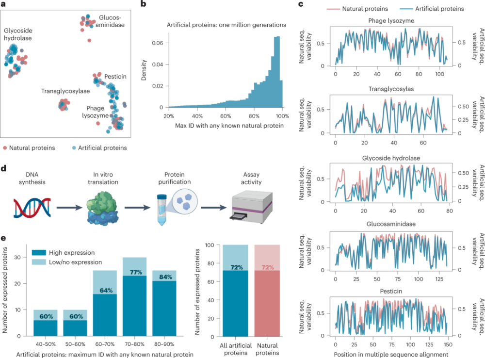 圖 3:人工蛋白質(zhì)序列具有功能,同時(shí)與任何已知蛋白質(zhì)的同一性低至 31%,表現(xiàn)出與高度進(jìn)化的天然蛋白質(zhì)相當(dāng)?shù)拇呋剩⒄故九c已知天然折疊相似的結(jié)構(gòu)。(來(lái)源:論文)