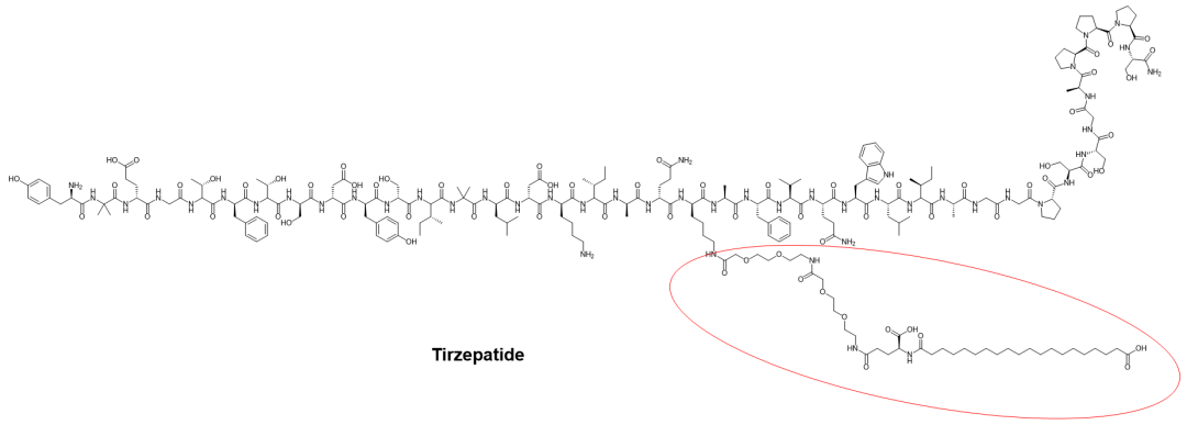 替爾泊肽(Tirzepatide,Mounjaro?)是禮來的2型糖尿病多肽藥物,是GLP-1/GIP受體共激動劑,通過皮下注射每周給藥一次。替爾泊肽是人類GIP(glucose-dependent insulinotropic peptide, 葡萄糖依賴性促胰島素多肽)的類似物,附有C20脂肪酸二酸部分,用于優(yōu)化化合物的攝取和代謝。脂肪二酸部分(二十烷二酸)通過谷氨酸和兩個(2-(2-氨基乙氧基)乙氧基)乙酸單元,連接到賴氨酸殘基的側(cè)鏈(圖4)。這個脂質(zhì)化修飾產(chǎn)生了更長的半衰期,并延長劑量之間的時間,替爾泊肽的半衰期約為5天。
