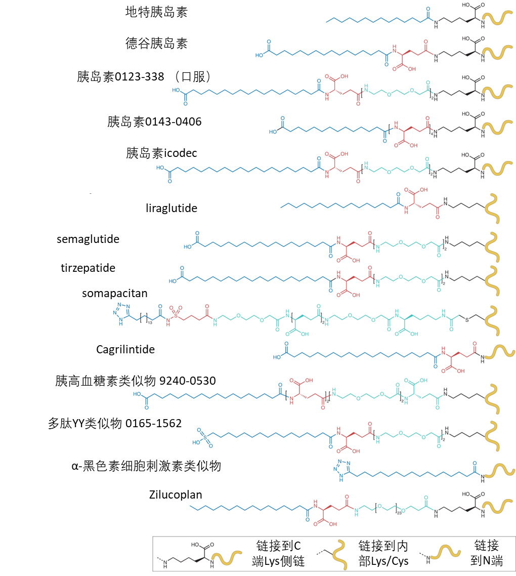 除了利拉魯肽、司美格魯肽和替爾泊肽之外,其它常見的多肽脂質(zhì)化修飾示意圖見下圖。