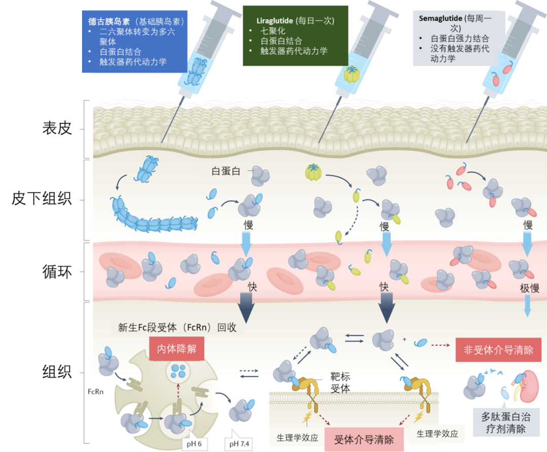 對于德谷胰島素和利拉魯肽,從皮下組織經(jīng)血液進入組織的分布過程中的決速步 (rate-limiting step)是單體的釋放,從而導致觸發(fā)器動力學(flip-flop kinetics)。在脂肪二酸的促進下,司美格魯肽強烈結合白蛋白,保護其受蛋白酶降解。在血液中,得到白蛋白蔭護的司美格魯肽形成了儲庫,其從中緩慢釋放。非白蛋白結合分子可以通過非受體介導的途徑消除,也可與靶受體結合以引發(fā)其生物學作用,然后被消除。如果空間參數(shù)允許的話,多肽-白蛋白復合體也可以與靶受體結合,并觸發(fā)生物學功效。