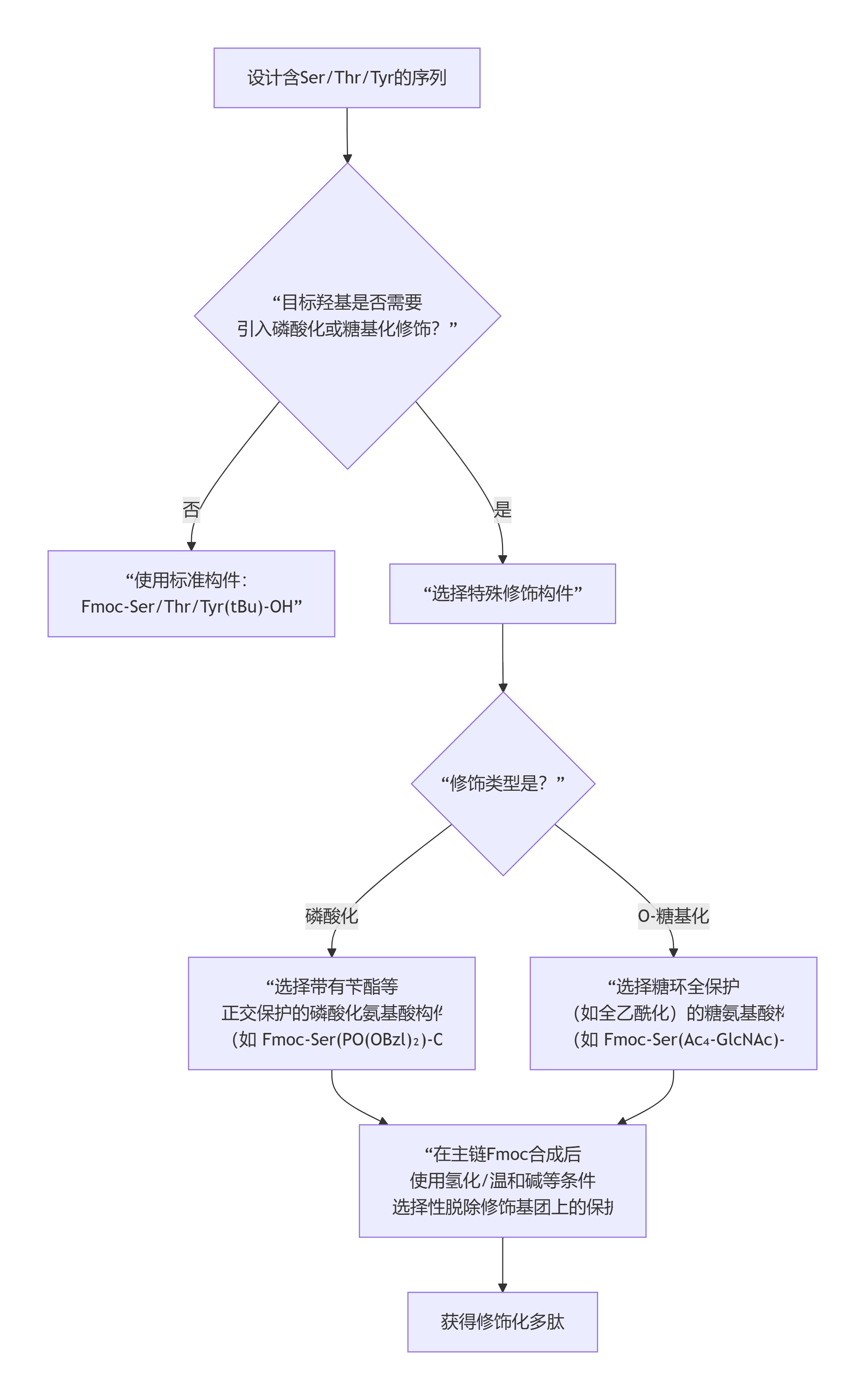 絲氨酸、蘇氨酸和酪氨酸的側(cè)鏈羥基是多肽中重要的極性、氫鍵供體/受體位點(diǎn),也是磷酸化、糖基化等關(guān)鍵翻譯后修飾的載體。在固相合成中,對羥基的保護(hù)需平衡合成期間的絕對穩(wěn)定性與最終功能化修飾的兼容性。本文旨在系統(tǒng)闡述以tBu(叔丁基)為代表的烷基保護(hù)策略的化學(xué)優(yōu)勢,并深入探討當(dāng)目標(biāo)多肽需要引入磷酸化或糖基化修飾時,保護(hù)基化學(xué)如何從“通用屏蔽”轉(zhuǎn)向“為功能設(shè)計”的前瞻性策略。